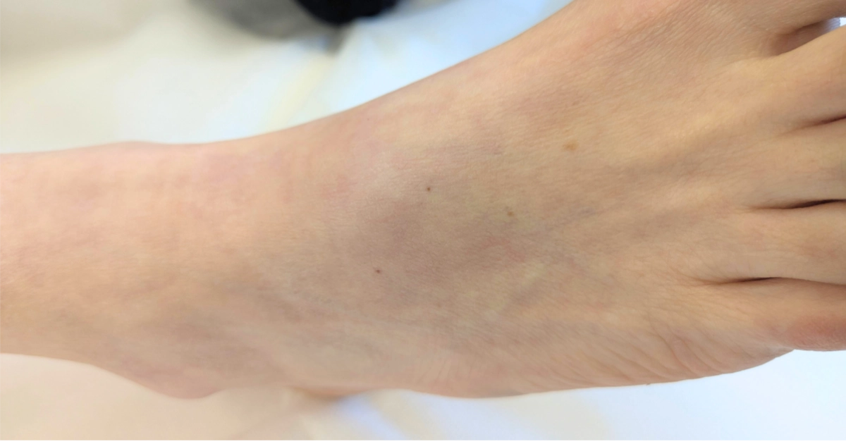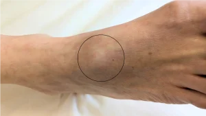 מטופלת הגיעה למרפאה עם בלט ברור בחלק הגבי (Dorsal) של כף רגל שמאל, אשר אובחן כגנגליון.