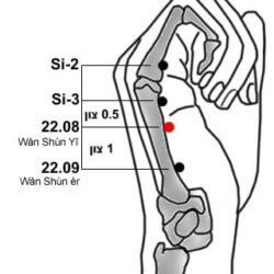 מיקום בחלק הלטרלי של העצם המטאקרפלית החמישית, 1.5 צון דיסטאלית לפרק כף היד. 1 צון פרוקסימלית ל- 22.08. שם הנקודה Wàn 腕 – פרק כף היד. Shùn 順 – זרימה, באותו כיוון, לציית. Er 二 – שניים. דיקור 1.5 – 1 צון. הערות ראה 22.08.
